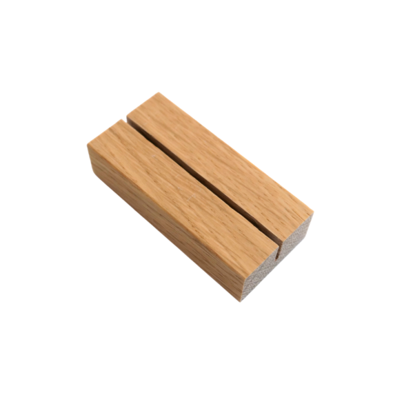 Elegant lille holder i massiv egetræ med en længde på 6 cm, højde på 1,5 cm og dybde på 2,9 cm. Velegnet til små skilte, kort, billeder og menukort – både dekorativ og funktionel.